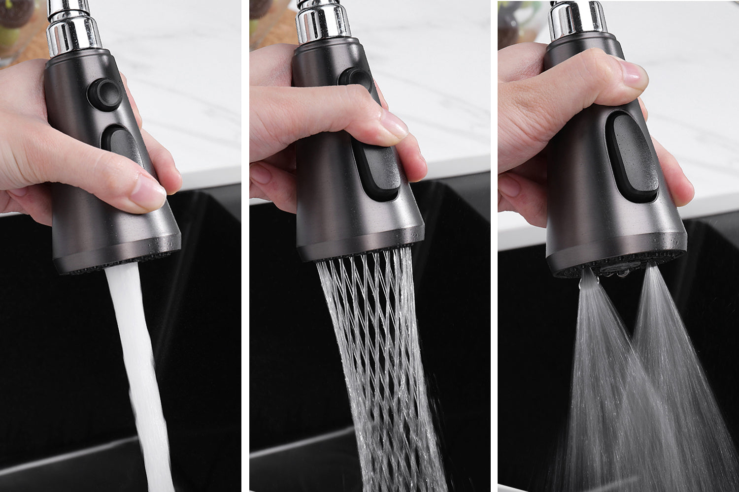 Cleaning dishes has never been easier thanks to the high-quality pull-out rotatable faucet. With multiple water modes, you can effortlessly switch from a powerful spray to a gentle stream, making it perfect for rinsing delicate fruits or tackling stubborn grime on pots and pans.