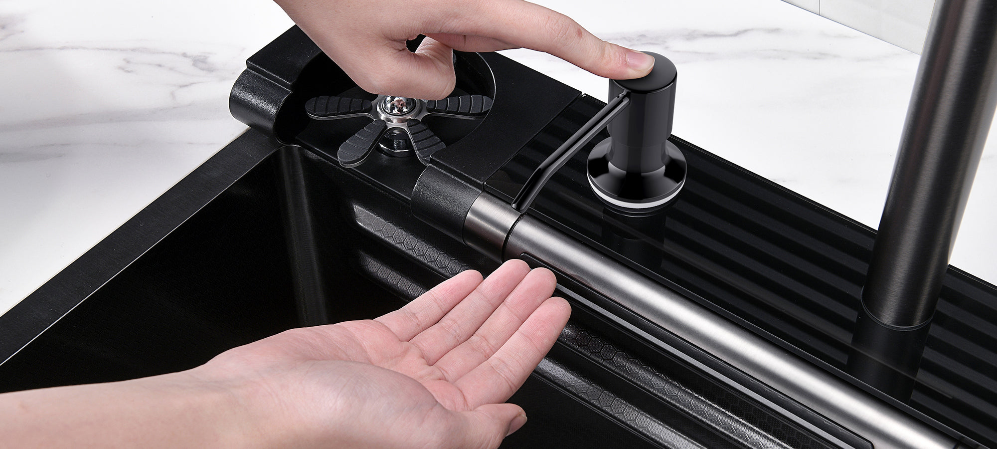 Easily switch between waterfall, rainfall, faucet, and cup washer with one-touch buttons. Drain the sink effortlessly with the smooth-turn titanium knob.